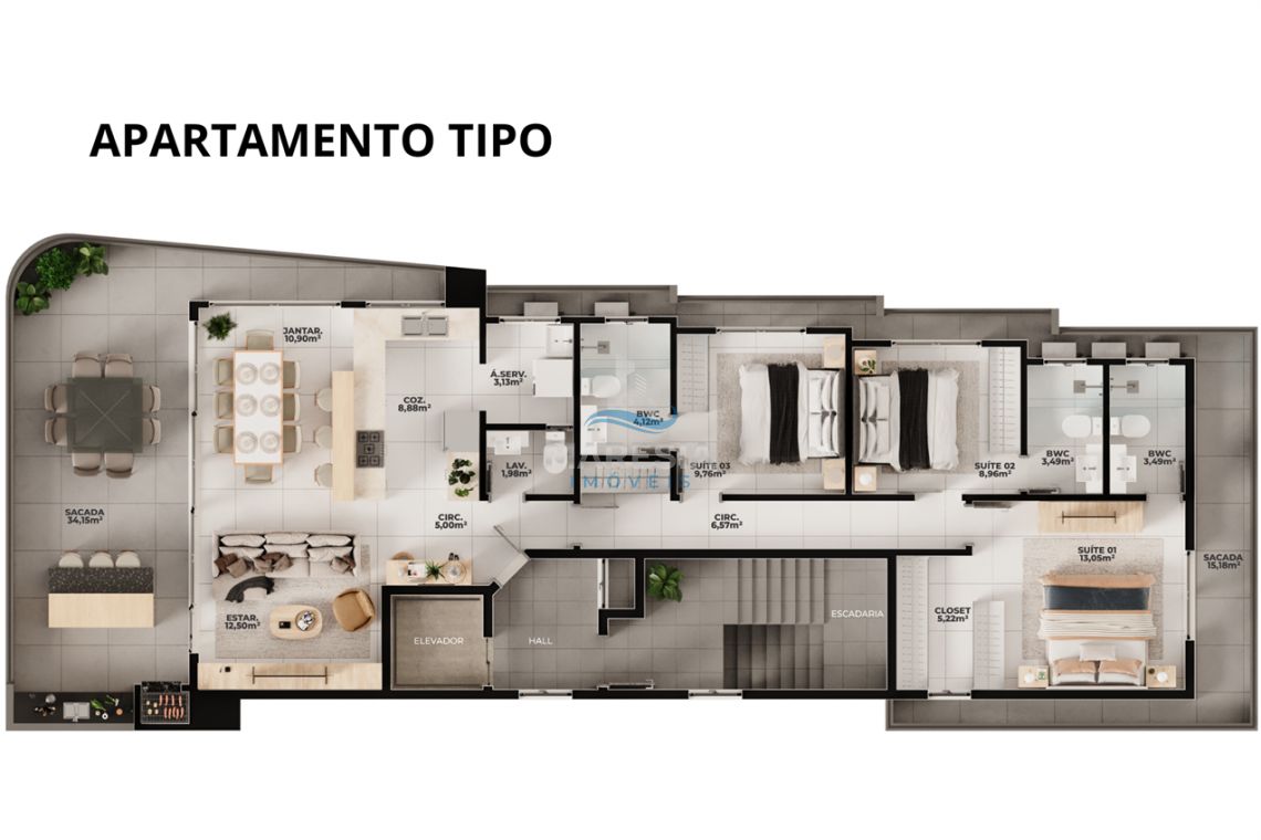 Apartamentos Tipo com 176,98 m ² de área privativa e 281,20 m² de área total distribuído em:
