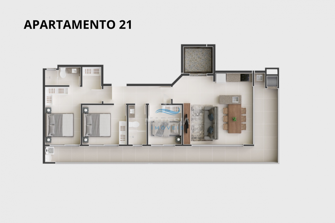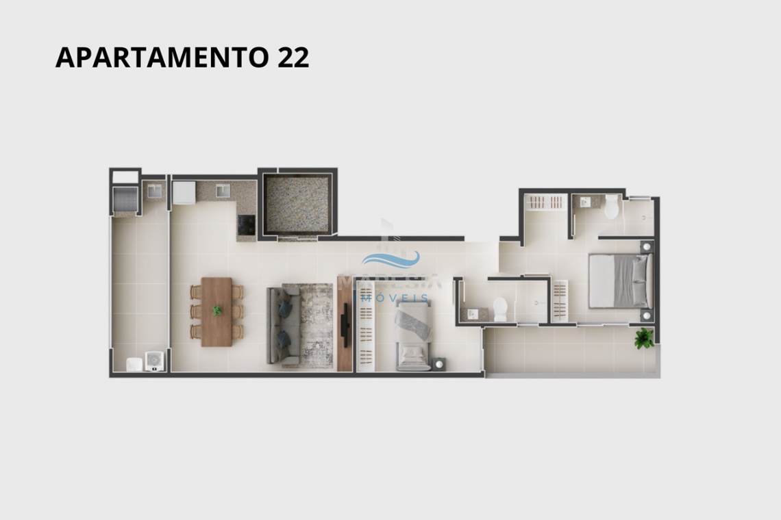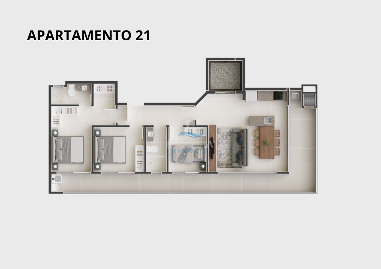 - Apartamento Tipo - 22-32: área total privativa de 79,90 m² (22) e 72,18 m² (32), divididos em 02 dormitórios, sendo 01 suíte, sacada com churrasqueira, 01 banheiro social, área de serviço, sala de estar integrada com a sala de jantar e cozinha e 02 vagas de garagem - Valor de R$ 960.000,00 (22) e R$ 990.000,00 (32)