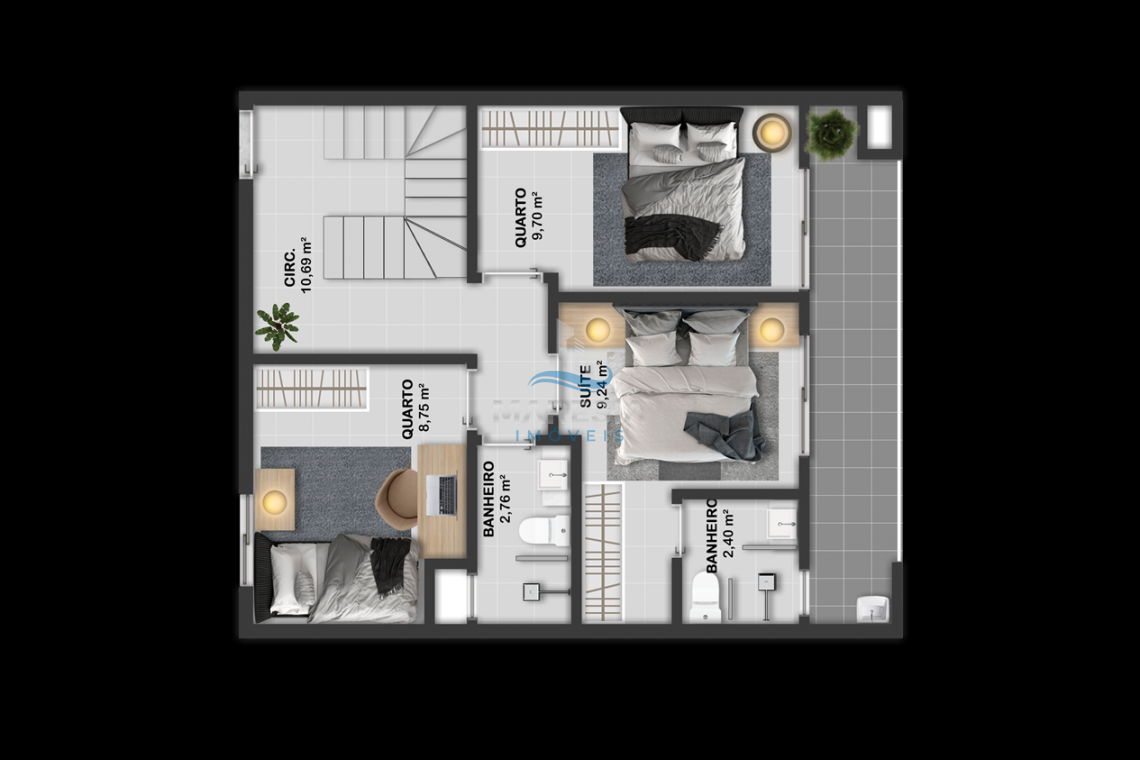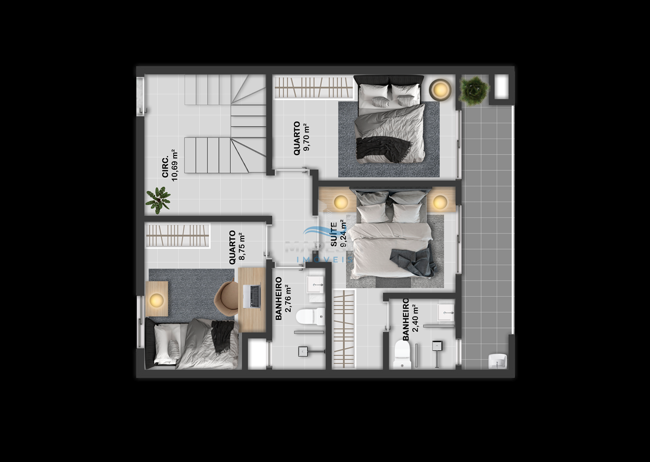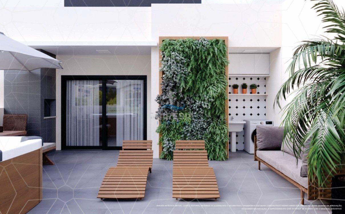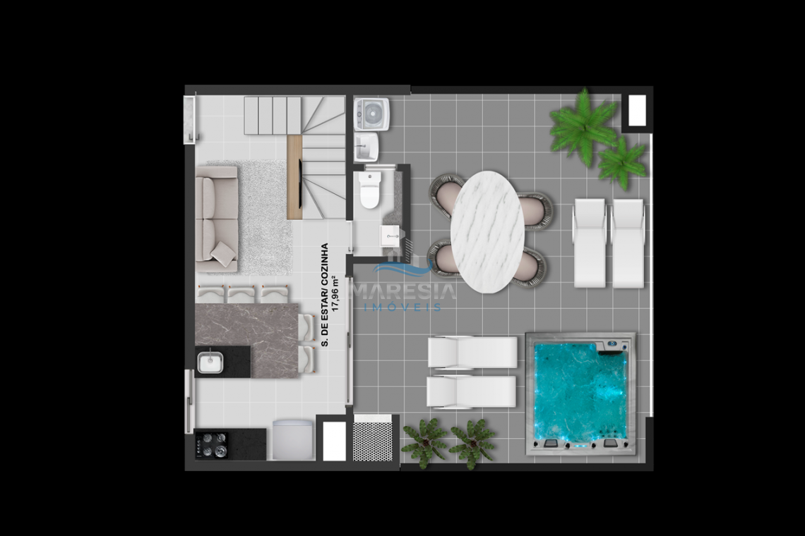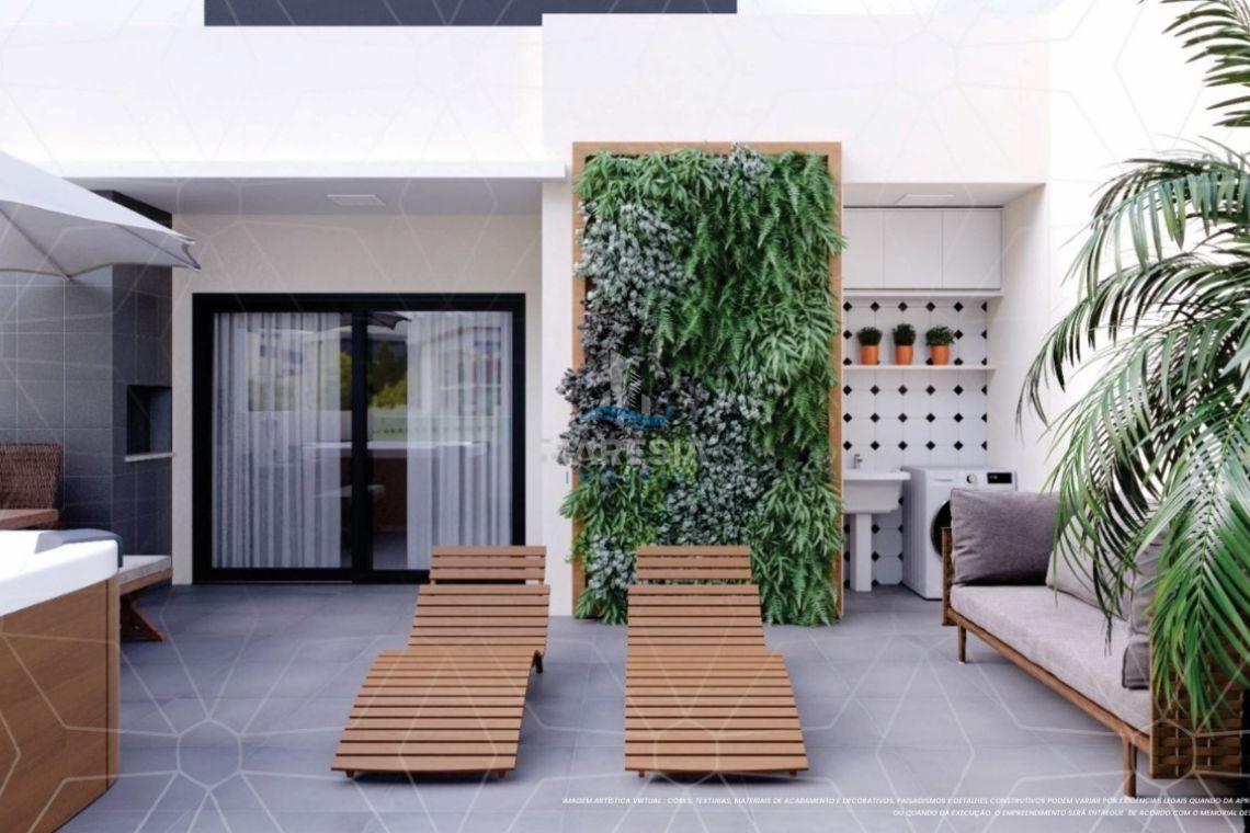 - Cobertura Duplex - 31, 33 e 34: área privativa de 118m² e total de 145m², divididos em 03 dormitórios, sendo 01 suíte, 01 banheiro social, todos no piso inferior. No piso superior 01 lavabo, sala de estar integrada com a sala de jantar e cozinha (espaço social), amplo terraço com churrasqueira e área de serviço - Valor a partir de R$ 949.000,00